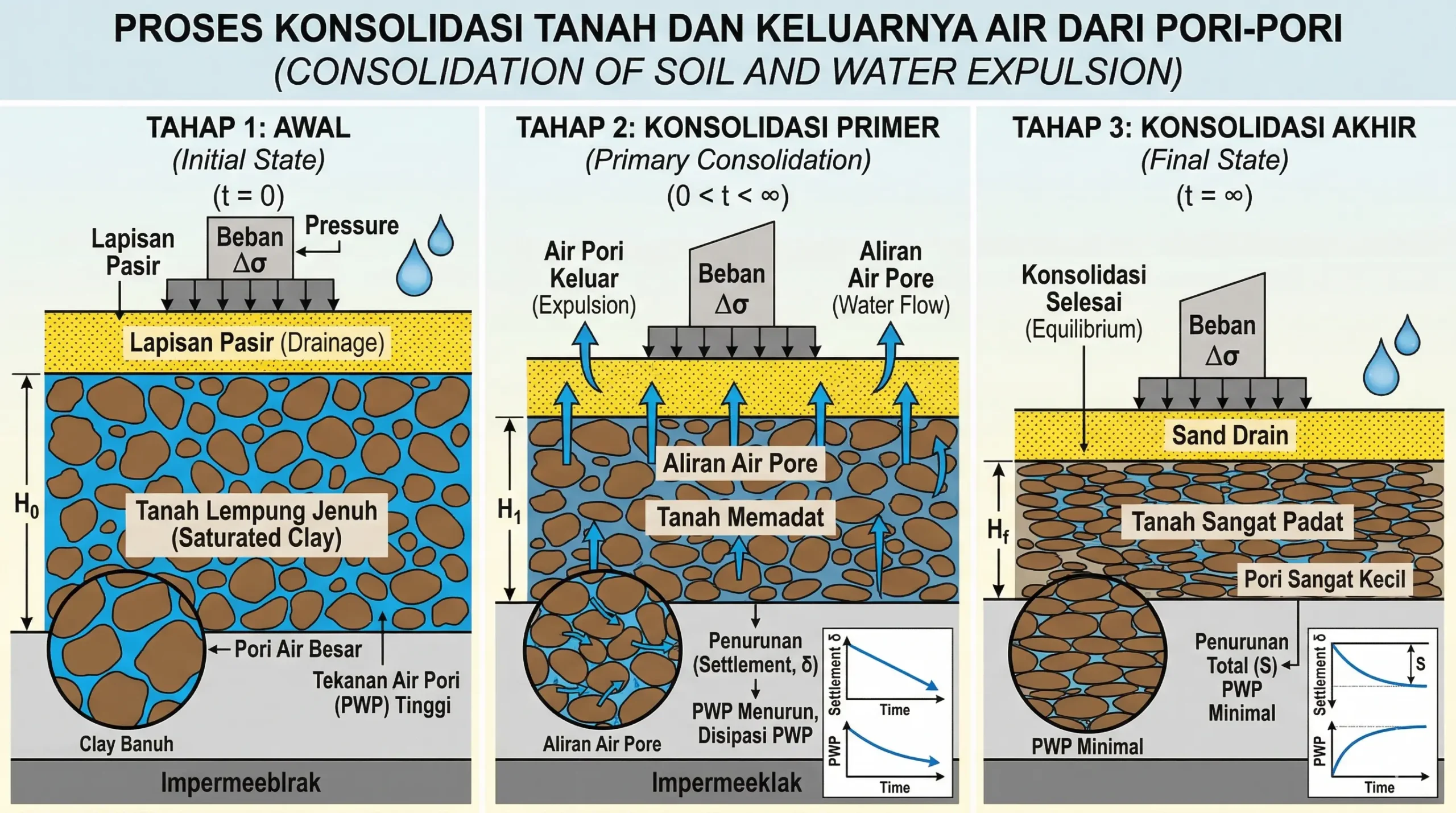Ketika sebuah beban yang sangat berat diletakkan di atas tanah tersebut, misalnya ratusan ton tanah timbunan untuk proyek jalan tol, beban itu akan menekan tanah di bawahnya. Tekanan ini memaksa air yang ada di dalam pori-pori tanah untuk keluar. Karena air keluar, rongga menjadi kosong dan butiran tanah merapat. Proses merapatnya butiran tanah akibat keluarnya air inilah yang menyebabkan permukaan tanah turun secara bertahap. Inilah yang disebut dengan Konsolidasi Tanah.