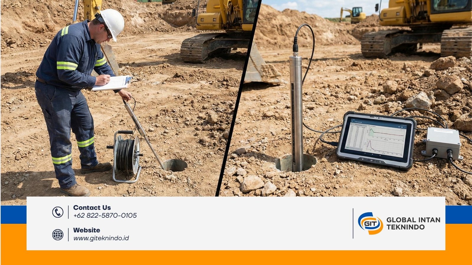 Seorang teknisi akan menurunkan alat sensor (disebut probe) ke dalam pipa yang sudah ditanam di tanah. Di setiap kedalaman tertentu (misalnya setiap 0.5 meter), teknisi akan berhenti, melihat angka di layar pembaca (readout unit), dan mencatatnya di kertas atau menekan tombol “simpan” secara manual satu per satu.