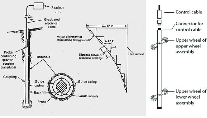 Probe inclinometer melintasi terdiri dari beberapa akselerometer penginderaan gravitasi dalam gerbong baja tahan karat. Ini berisi dua set roda pegas yang memandu probe secara akurat pada kedalaman berapa pun di dalam casing. Jarak antar roda biasanya 0,5 m. Pengukuran dilakukan pada sumbu A yaitu searah dengan roda dan sumbu B yaitu tegak lurus terhadap sumbu A. Probe untuk casing horizontal dibuat berbeda. Sensor dipasang untuk mengukur perpindahan vertikal sambil menjaga roda pelacakan bawah tetap.- Inclinometer Casing