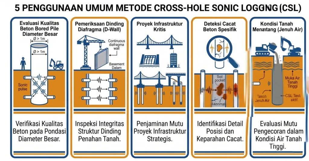 Pengujian Crosshole Sonic Logging (CSL) sangat direkomendasikan dan sering kali diwajibkan untuk: