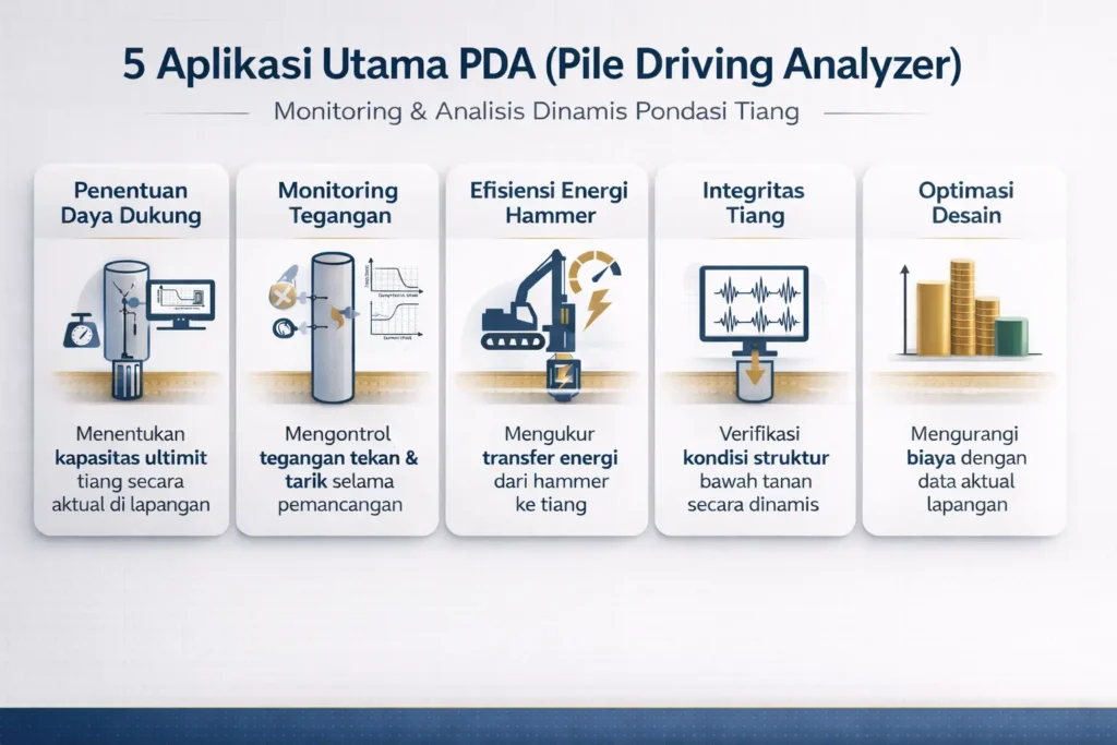 Bagi kontraktor dan konsultan perencana, pengujian PDA adalah solusi yang jauh lebih cepat, efisien, dan ekonomis dibandingkan Static Load Test, namun tetap memberikan tingkat keandalan data yang memenuhi standar keamanan struktural tinggi.