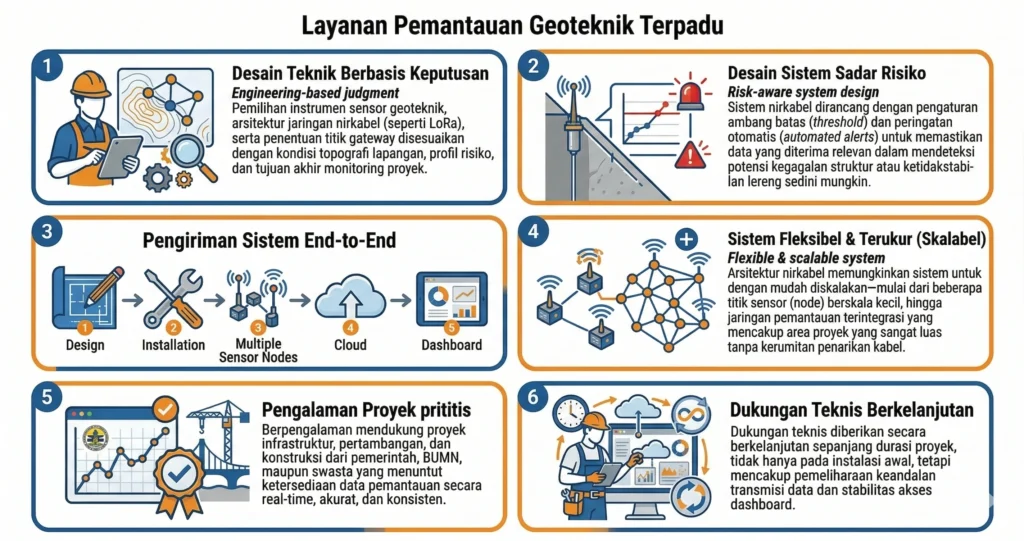 - End-to-end system delivery Layanan komprehensif mencakup desain sistem monitoring, penyediaan dan integrasi sensor, instalasi jaringan nirkabel di lapangan, konfigurasi dashboard cloud, hingga validasi data dan dukungan interpretasi teknis.