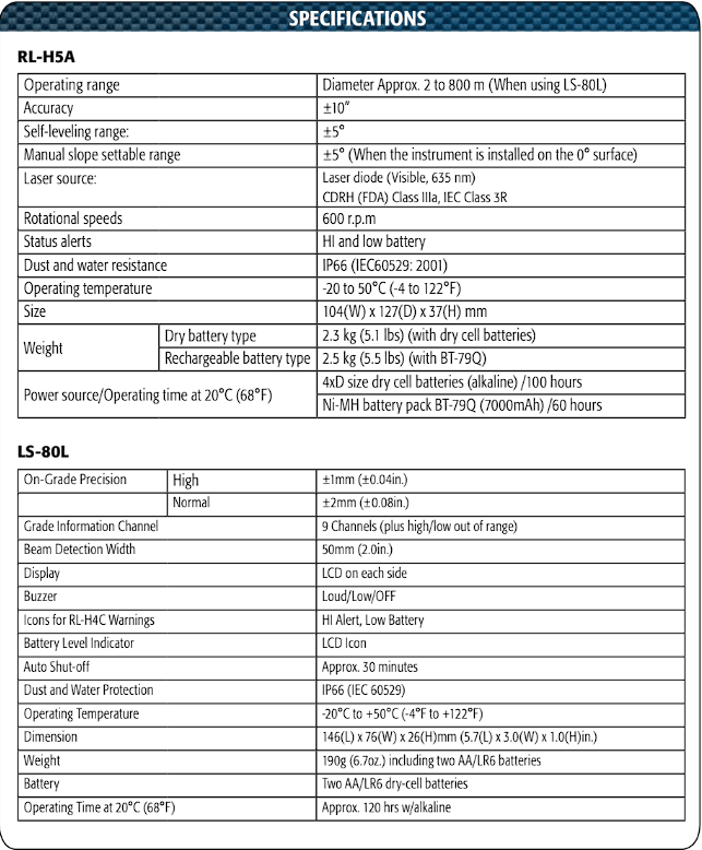 Dengan peringkat IP66, Topcon RL-H5A terlindung dari debu dan pancaran air bertekanan rendah. Laser putar ini menggunakan sel kering atau baterai isi ulang yang dapat memberi daya pada perangkat hingga 100 jam, menjadikannya teman yang baik untuk seharian bekerja. Dengan berat hanya 5,07 pon, level laser ini berukuran 6,77″ L x 8,31″ W x 8,07″ H.