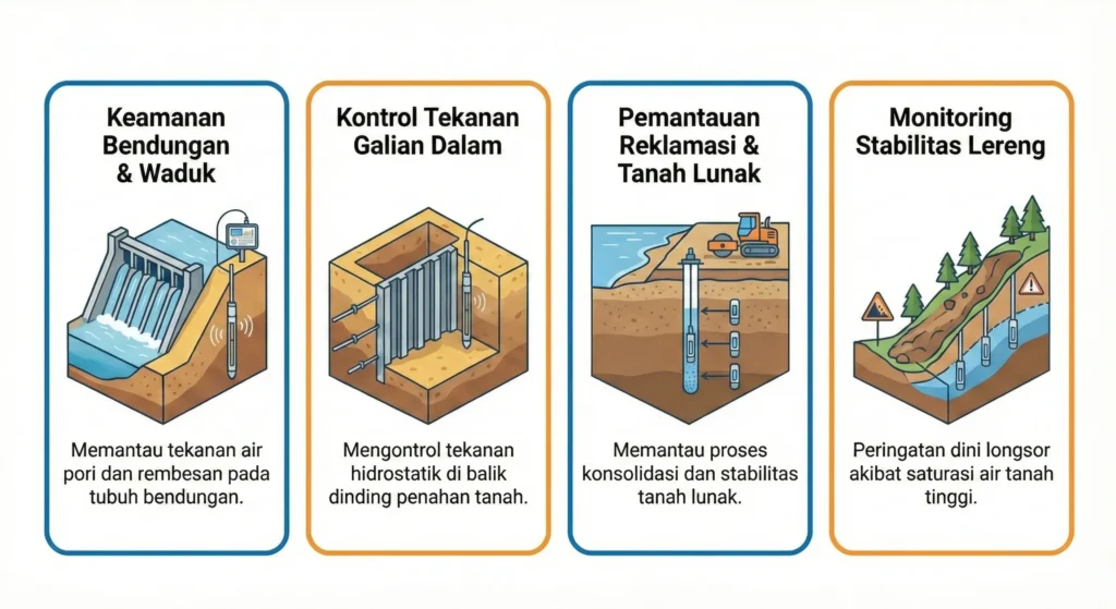 - Proyek reklamasi atau konstruksi di atas tanah lunak yang memerlukan pemantauan proses konsolidasi.