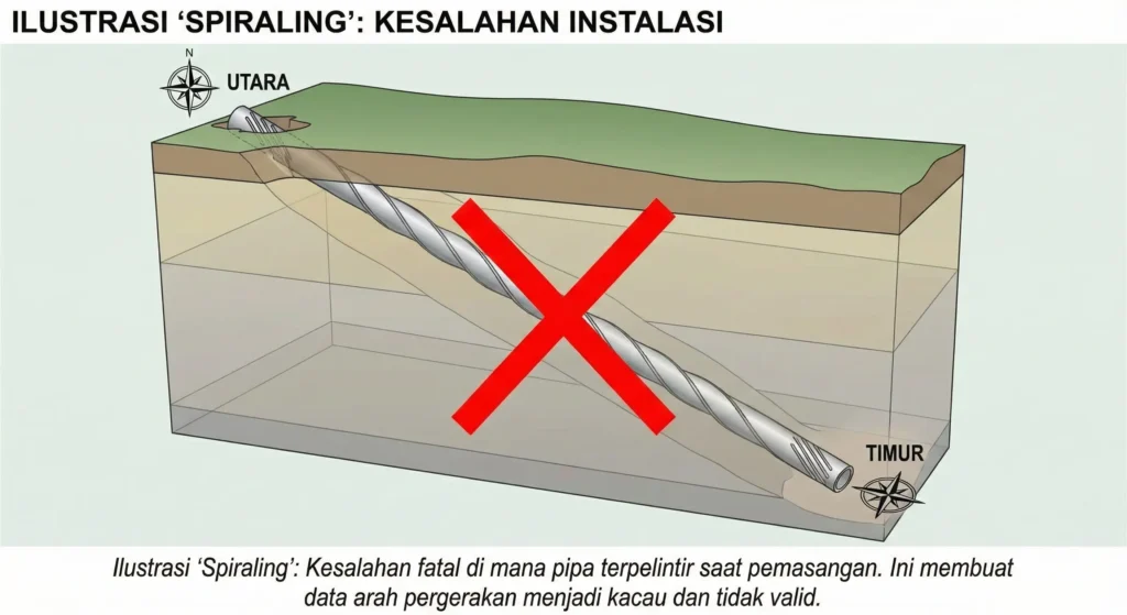 Pipa Melintir (Spiraling): Saat memasang pipa panjang, pipa bisa terpuntir. Akibatnya, arah “Utara” di bawah tanah berbeda dengan di permukaan. Standar ASTM menyediakan metode untuk mengoreksi data ini, tetapi lebih baik jika pemasangannya lurus sejak awal.