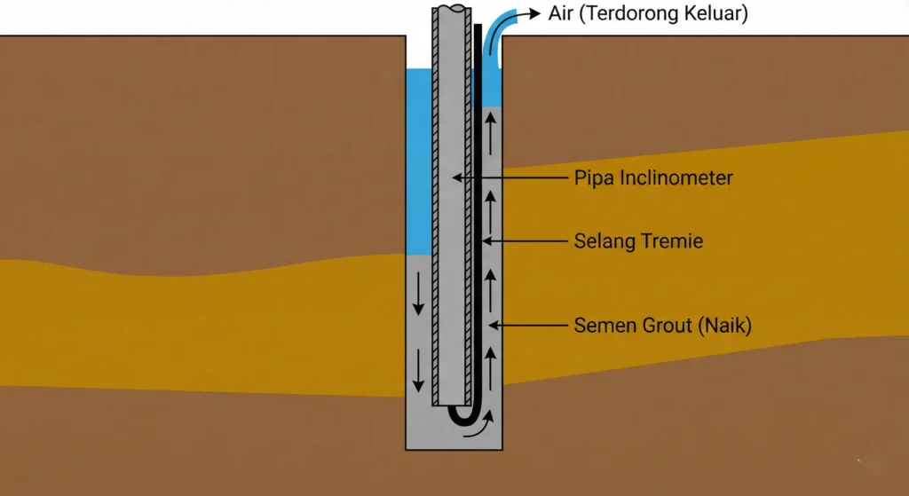 Grouting: Campuran semen khusus dipompa dari dasar lubang ke atas (menggunakan pipa tremie) untuk mendorong air kotor keluar dan menggantinya dengan semen.